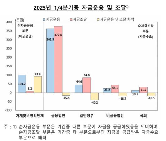 이중 가계 및 비영리단체는 연초 상여금 유입 등으로 가계소득이 증가한 가운데 아파트 신규입주물량 감소, 소비 둔화 등으로 여유자금이 증가하여 순자금운용 규모가 92.9조원으로 전분기(62.6조원) 대비 확대됐다.