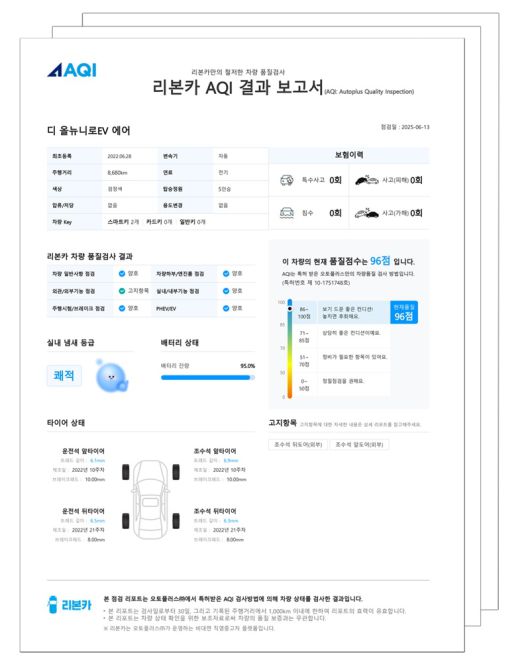 이에 비대면 직영인증중고차 플랫폼 리본카는 중고차 구매 시 반드시 확인해야 할 '성능·상태 점검 기록부'의 핵심 체크 포인트와 함께, 리본카만의 'AQI(Autoplus Quality Inspection) 리포트'와 '가성비 리포트'를 통해 차량 상태를 더욱 쉽고 객관적으로 확인할 수 있도록 돕고 있다. 'AQI 리포트'는 리본카 홈페이지 내 차량 상세 페이지를 통해 확인할 수 있다.
