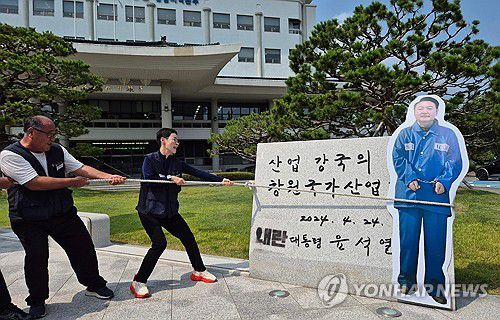 민주노총 경남본부 등은 8일 창원시 성산구 한국산업단지공단 경남지역본부 앞마당에 설치된 윤 전 대통령 친필 휘호 표지석 옆에서 기자회견을 열고 "헌법재판소의 윤석열 전 대통령 파면과 특검팀의 구속영장 청구는 민주노총 경남본부의 행동이 정당하다는 것을 입증한다"고 주장했다.