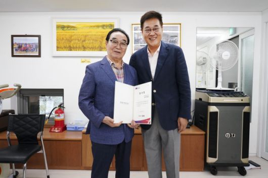 정문헌 종로구청장 ‘실내공기질 관리 우수시설’ 선정 - 실내공기질 관리 우수시설로 선정된 은행나무경로당에서 정문헌(오른쪽) 종로구청장과 김두옥 회장이 기념 촬영을 하고 있다. 종로구 제공 |