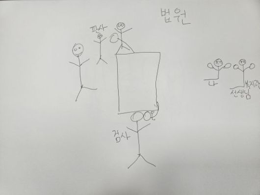 현우씨 시선에서 본 수사와 재판의 모습. 지난 7월 3일 선고 직후 현우씨에게 수사와 재판 과정이 어땠냐고 묻자 현우씨가 직접 그린 그림이다. 실제 이 사건 경찰 조사 단계에서 신뢰관계인의 동석 신청권이 보장되지 않아, 재판부는 피의자신문조서의 증거능력을 기각했다. |