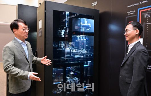 이재성 LG전자 ES사업본부장 부사장(왼쪽)이 8일 마곡 LG사이언스파크에서 열린 기자간담회에서 AI 데이터센터 액체냉각 솔루션인 CDU(Coolant Distribution Unit; 냉각수 분배 장치)를 살펴보는 모습.(사진=LG전자) |