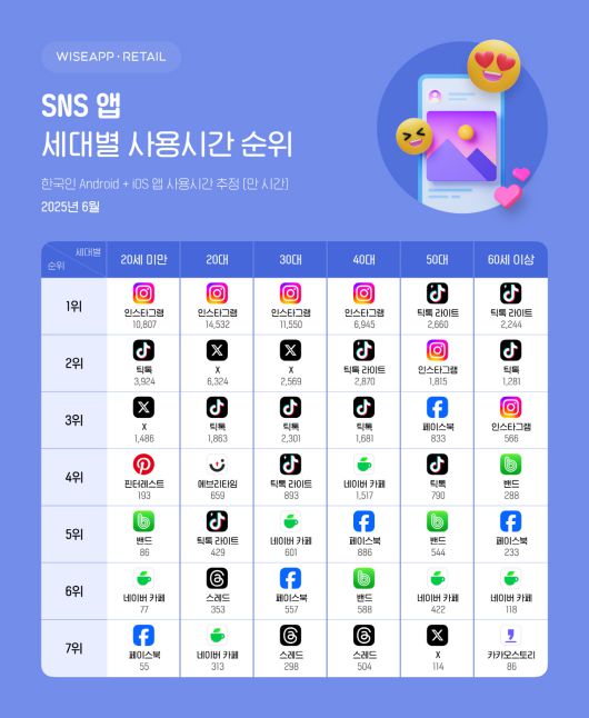 세대별 사용 시간 2위와 3위는 20세 미만에서 틱톡과 엑스, 20·30대는 엑스와 틱톡, 40대는 틱톡 라이트와 틱톡, 50대는 인스타그램과 페이스북, 60세 이상은 틱톡과 인스타그램 순으로 조사됐다.