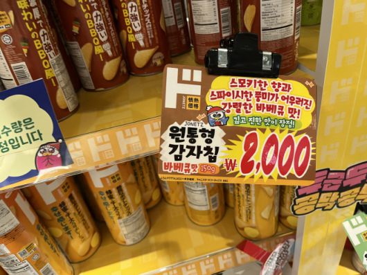 돈키호테 인기 제품인 원통형 감자칩. 2000원에 판매되고 있다. 다채로운 색상의 문구들이 눈길을 끌었다./ 최영 인턴기자 |