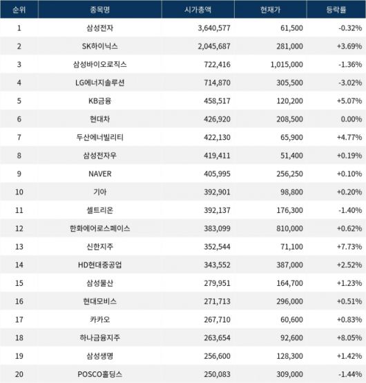 하나금융지주(086790) 8.05% 상승 SK하이닉스(000660) 3.69% 상승 두산에너빌리티(034020) 4.77% 상승