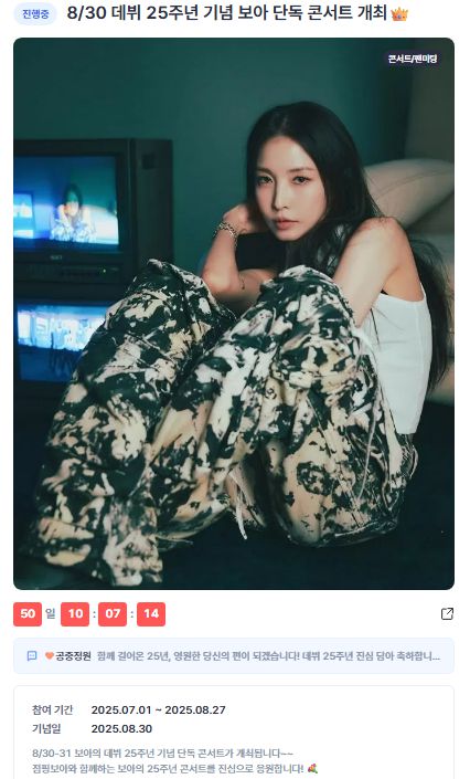 한편, 디시트렌드 응원 탭에서는 보아의 데뷔 25주년 단독 콘서트를 축하하는 온라인 이벤트가 진행 중이다. 참여 기간은 지난 1일부터 오는 8월 27일까지이며, 기념일은 보아의 단독 콘서트 첫날인 8월 30일이다. 팬들은 해당 응원 탭을 통해 하트를 누르거나 댓글을 작성해 콘서트 개최를 응원하고 있다.