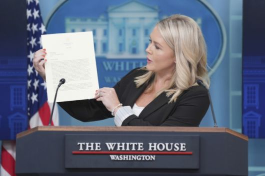 [워싱턴=AP/뉴시스] 캐롤라인 레빗 백악관 대변인이 7일(현지 시간) 백악관에서 브리핑하면서 도널드 트럼프 미국 대통령이 이재명 대통령에게 보내는 서한을 들어 보이고 있다. 트럼프는 이 대통령에게 보내는 서한에서 "2025년 8월 1일부터 한국에서 수입하는 모든 제품에 대해 기존의 부문별 관세와는 별도로 25%의 관세를 부과할 예정"이라고 밝혔다. 2025.07.08 |