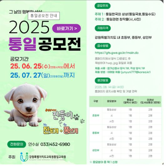 강원특별자치도교육청통일교육원은 오는 25일부터 다음달 27일까지 통일 공모전을 운영한다.