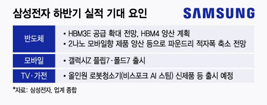 삼성전자 실적이 2분기 바닥을 찍고 하반기 반등할 것이란 전망이 나온다. 반도체 부문에서 2분기 재고자산 평가 충당금을 반영해 회계상 비용을 미리 털어냈다. 하반기 최신 HBM(고대역폭메모리) 판매 확대와 최선단 파운드리 공정 사업 성과 가시화가 기대된다. 갤럭시 신제품 출시 등 영향으로 DX(디바이스경험) 부문 실적 성장도 예상된다.