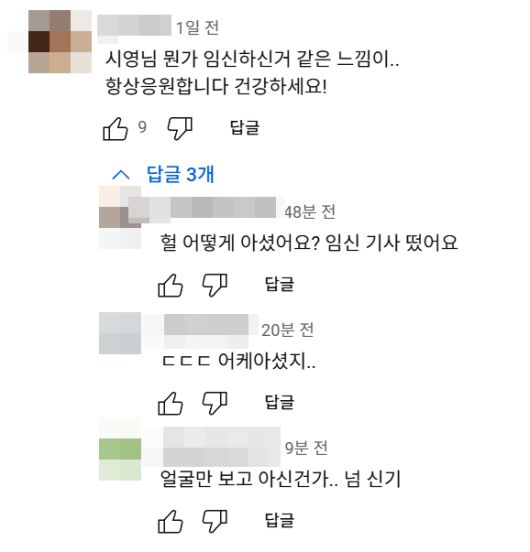 이시영의 이혼이 알려진 상황이었기에 임신일 것이라고는 대부분 예상하지 못했던 상황. 이시영의 임신 고백 하루 전인 7일 한 네티즌은 "시영님 뭔가 임신한 거 같은 느낌이.. 항상 응원합니다 건강하세요!"라는 댓글을 달았다. 임신 사실이 알려진 현재 많은 네티즌들은 이러한 성지글에 놀라움을 표하며 "헐 어떻게 아셨어요? 기사 떴어요", "어떻게 아셨지", "얼굴만 보고 아신 건가 너무 신기" 등의 댓글을 달고 있다.
