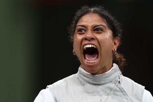 프랑스의 이사오라 티뷔스가 2024년 8월 1일 파리 그랑 팔레에서 열린 파리 2024올림픽 여자 플뢰레 단체전 8강전에서 캐나다의 제시카 지아 궈와 경쟁하며 포효하고 있다.AFP=연합뉴스 |