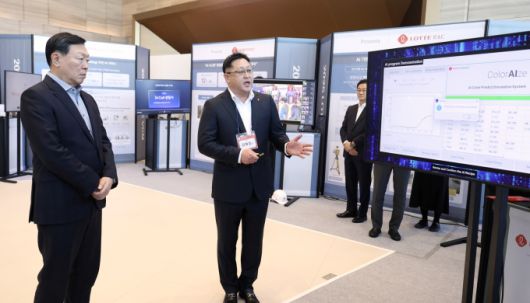 롯데는 지난 1월 9일 롯데월드타워에서 '2025 상반기 VCM'을 개최했다. 신동빈 롯데 회장(사진 왼쪽)이 롯데케미칼의 'AI 기반 컬러 예측 시스템'에 대한 설명을 듣고 있다. [사진=롯데지주 제공] |