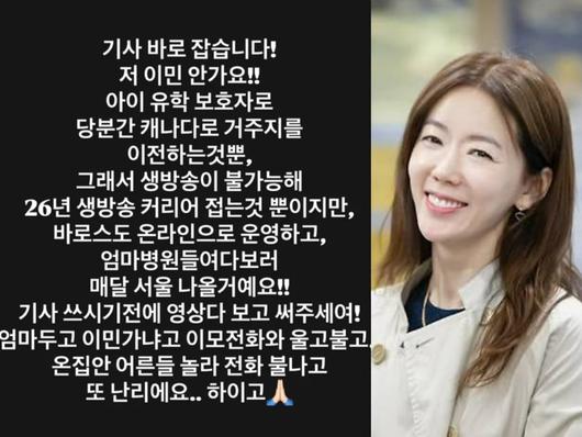 방송인 안선영이 캐나다 이민설에 대해 직접 해명하며 사실과 다른 보도에 선을 그었다.