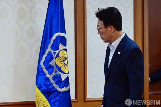 [서울=뉴스핌] 이길동 기자 =김민석 국무총리가 8일 오후 서울 종로구 정부서울청사 집무실에 도착해 총리실기를 바라보고 있다.2025.07.08 gdlee@newspim.com