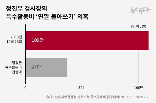 정 검사장이 진주지청장 재임 기간 중 가장 많은 특활비를 쓴 날은 2019년 12월 26일이다. ▲현금 30만 원 3건, 현금 19만 원 1건 등 ▲총 4건, 109만 원의 특활비를 집행했다. 진주지청장 시절 1일 평균 특활비 집행액 37만 원의 3배에 이른다.