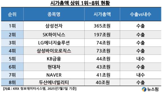 한국 증시에 상장된 시가총액 상위 8개 종목을 살펴보면 수출주가 6종목, 내수주가 2종목이다. 대표적으로는 반도체 원투 펀치인 삼성전자와 SK하이닉스가 있다. LG에너지솔루션(2차전지), 삼성바이오로직스(의약품 위탁생산), 현대차(자동차)도 대표적인 수출기업이다.