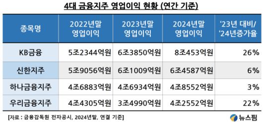 수출주가 관세 전쟁 여파로 실적 편차가 커지고 있는 가운데 대표적인 내수주로 손꼽히는 금융권은 축제 분위기다. 2024년에는 KB금융은 무려 8조453억원으로 사상 최대 영업이익을 달성했다. 전년 대비 증가율도 26%로 4대 금융지주 중 가장 높다.