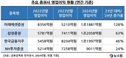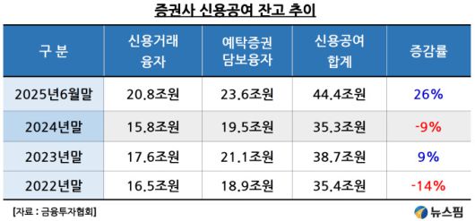 하지만 올해 들어 한국 증시가 살아나면서 2025년 6월말 기준 신용공여 합계는 전년말보다 무려 9조1000억원이 늘어난 44조4000억원을 기록했다. 26%의 엄청난 증가율이다. 이는 고스란히 증권사의 수익 증가로 이어진다.