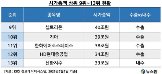 시가총액 상위 9위~13위 종목을 살펴보면 수출주가 4종목, 내수주가 1종목이다. 수출주도형 국가답게 시총 상위 종목은 수출주가 대부분이다. 셀트리온(바이오시밀러), 기아(자동차), 한화에어로스페이스(방위산업), HD현대중공업(조선업) 등이 대표적이다.