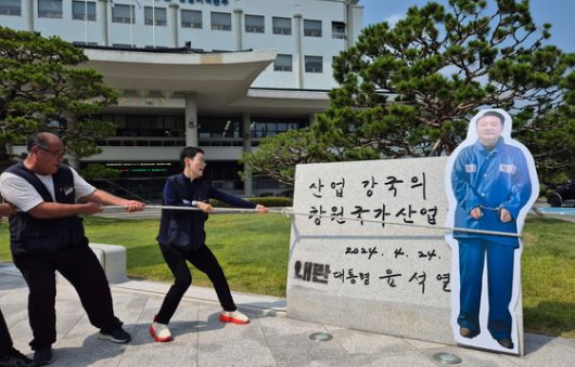 윤석열 전 대통령 친필 휘호 표지석을 훼손한 혐의로 민주노총 경남본부 소속 40대 A씨가 검찰에 송치되자 지역 노동계가 8일 경남 창원시 성산구 한국산업단지공단 경남지역본부 앞마당에 설치된 이 표지석을 밧줄로 묶고 잡아당기는 퍼포먼스를 하고 있다. 연합뉴스 |
