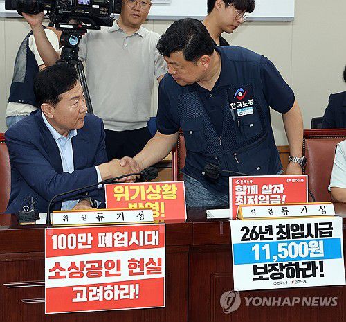 (세종=연합뉴스) 배재만 기자 = 최저임금위원회 사용자위원인 류기정 한국경영자총협회 전무(왼쪽)와 근로자위원인 류기섭 한국노총 사무총장이 8일 정부세종청사에서 열린 최저임금위원회 제10차 전원회의에 입장하며 악수를 나누고 있다. 2025.7.8