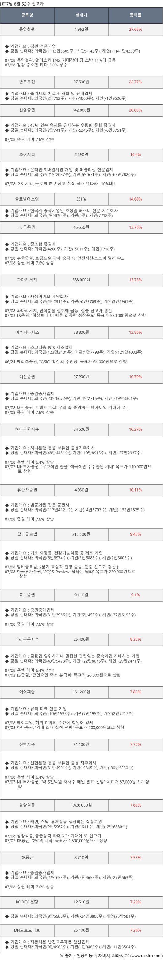 ※ 관련 종목: 동양철관, 안트로젠, 신영증권, 조이시티, 글로벌에스엠, 부국증권, 파마리서치, 이수페타시스, 대신증권, 하나금융지주, 유안타증권, 달바글로벌, 교보증권, 우리금융지주, 에이피알, 신한지주, 삼양식품, DB증권, KODEX 은행, DN오토모티브