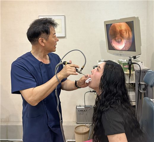아름다운목소리이비인후과 김영호 원장이 후두내시경으로 환자의 성대를 살피며 진료하고 있다. /아름다운목소리이비인후과 |