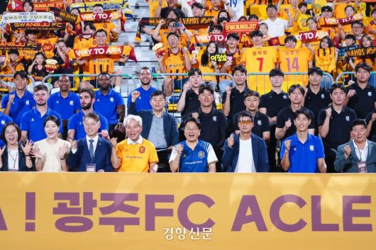 2024년 9월 강기정 광주시장과 팬들이 광주 서구 광주축구전용구장에서 열린 2024 광주FC 아시아챔피언스리그(ACLE) 출정식에서 선전을 기원하고 있다. 광주시 제공 |