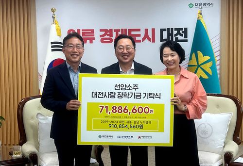 (대전=연합뉴스) 강수환 기자 = 충청지역 주류기업 선양소주는 8일 대전시에 '대전사랑 장학기금' 7천186만6천원을 전달했다고 밝혔다.