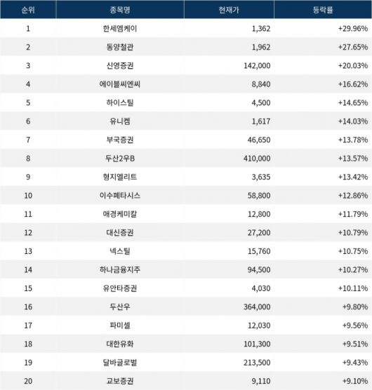 이밖에도 애경케미칼(161000) ▲11.79%, 대신증권(003540) ▲10.79%, 넥스틸(092790) ▲10.75%, 하나금융지주(086790) ▲10.27%, 유안타증권(003470) ▲10.11%, 두산우(000155) ▲9.80%, 파미셀(005690) ▲9.56%, 대한유화(006650) ▲9.51%, 달바글로벌(483650) ▲9.43%, 교보증권(030610) ▲9.10% 등을 기록하며 금일 증시를 상승으로 마감했다.