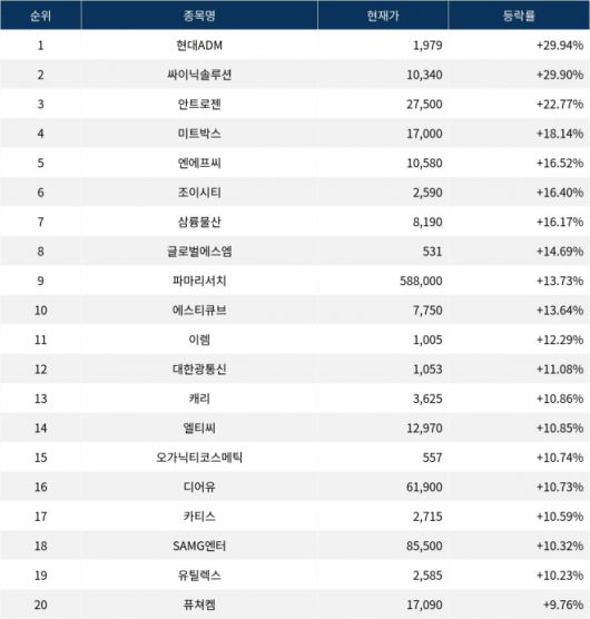 6위 조이시티(067000)는 종가 2,590원으로 16.40% 급등 마감했다. 7위 삼륭물산(014970)은 종가 8,190원으로 16.17% 급등 마감했다. 8위 글로벌에스엠(900070)은 종가 531원으로 14.69% 급등 마감했다. 9위 파마리서치(214450)는 종가 588,000원으로 13.73% 급등 마감했다. 10위 에스티큐브(052020)는 종가 7,750원으로 13.64% 급등 마감했다.