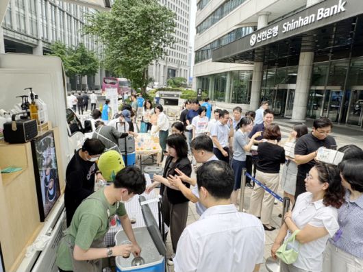해피빈은 지난 7일 신한은행 창립 43주년을 맞아 신한은행 본점으로 커피차를 지원했다. 신한은행은 2012년부터 13년째 해피빈 최장 파트너사로 매월 '사랑의클릭' 임직원 기부를 통해 다양한 계층의 어려운 이웃들을 돕고 있다. 이번 커피차 지원은 창립 기념일을 축하하며 매월 정기적인 기부로 선한 영향력을 펼치는 임직원 기부자를 예우하는 감사 의미를 자연스럽게 전하자는 취지다.