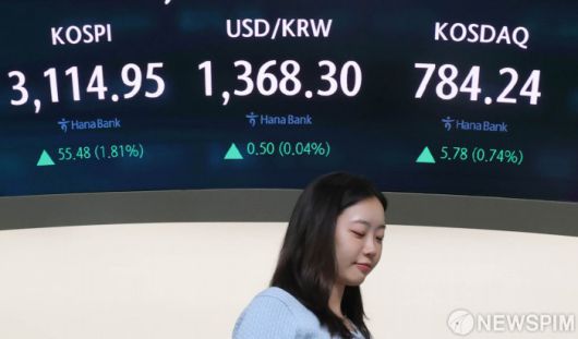[서울=뉴스핌] 양윤모 기자 = 외국인과 기관 매수세가 유입속 8일 오후 코스피가 전장 종가보다 55.48 포인트(1.81%) 상승하며 3,114.95로, 코스닥은 5.78포인트(0.74%) 상승한 784.24로 마감한 가운데, 서울 중구 하나은행 딜링룸에서 직원들이 업무를 보고 있다. 서울외환시장에서 원·달러 환율은 전장 대비 0.50원 상승한 1,368.30원에 거래를 마감했다. 2025.07.08 yym58@newspim.com