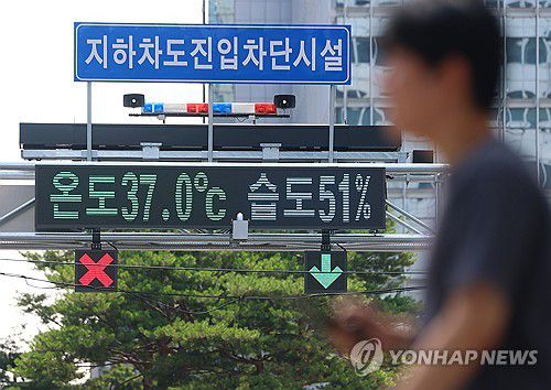 (서울=연합뉴스) 김도훈 기자 = 서울 기온이 근대적인 기상관측을 시작한 이래 7월 상순 기온으론 역대 최고치를 기록한 8일 서울 시내의 한 스크린에 '온도 37도'가 표시돼 있다. 2025.7.8