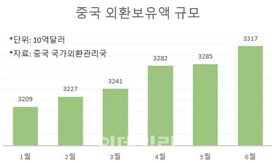 중국 외환 보유액은 6개월 연속 전월대비 증가세를 이어갔다. 또 19개월째 외환보유 규모 3조2000억달러 이상을 유지했다. 그만큼 외환보유액이 큰 변동 없이 안정적 수준이라는 의미다.