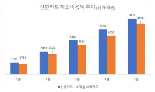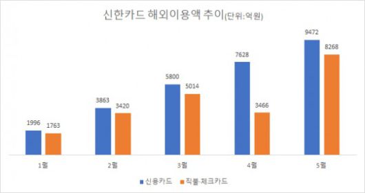 4일 카드업계에 따르면, 올해 5월 말 기준 신한카드의 개인 신용카드와 직불·체크카드 해외이용금액은 총 1조 7840억원으로 집계됐다. 이는 전체 카드사 중 가장 많은 금액이다.