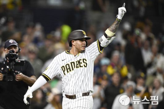 [샌디에이고 로이터=뉴스핌] 손지호 기자 = 샌디에이고 파드리스 매니 마차도가 8일(한국시간) 열린 애리조나와의 홈 경기서 8회 솔로 홈런을 친 후 기뻐하고 있다. 2025.07.08 thswlgh50@newspim.com |