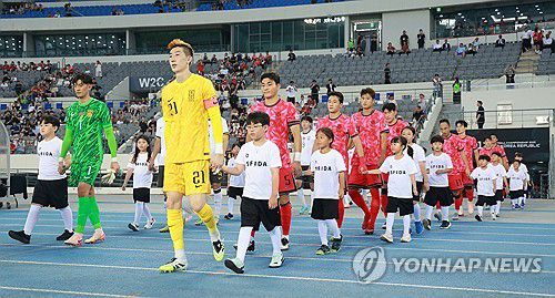 빈 관중석 배경으로 경기장 입장하는 축구대표팀 |
