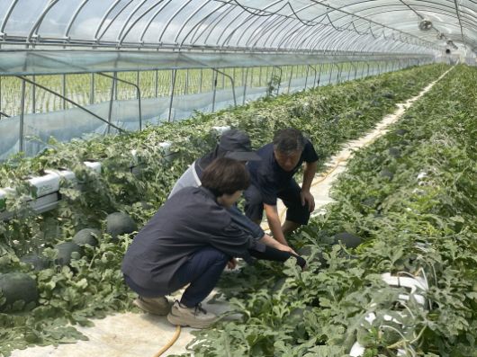 ▲농업기술센터 직원들이 하우스 수박을 살펴보고 있다. ⓒ정읍시 |