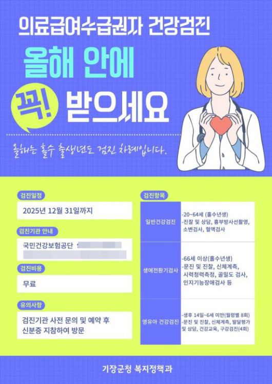 정종복 기장군수는 "건강검진은 질병을 조기에 발견하고 적절히 치료하기 위한 첫걸음"이라며 "수검자들이 연말에 몰릴 경우 예약이 어려워질 수 있으니 가능한 한 이른 시일 내에 검진에 참여해 주시길 바란다"고 당부했다.