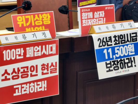 [세종=뉴스핌] 양가희 기자 = 3일 오후 3시 정부세종청사에서 열린 최저임금위원회 제9차 전원회의 사용자위원 대표 류기정 경총 전무와 근로자위원 대표 류기섭 한국노총 사무총장 좌석 앞에 각각 '100만 폐업시대 소상공인 현실 고려하라!' '26년 최임시급 11,500원 보장하라! 문구가 적힌 종이가 붙어 있다. 2025.07.03 sheep@newspim.com |