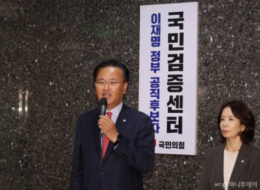 [서울=뉴시스] 김금보 기자 = 이재명 정부 공직수보자 국민검증센터 단장을 맡은 유상범 국민의힘 의원이 8일 국회에서 열린 '이재명 정부 공직후보자 국민검증센터' 현판식에서 발언하고 있다. (공동취재) 2025.07.08. photo@newsis.com /사진= |