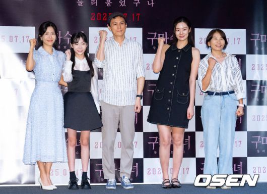 [OSEN=김성락 기자] 8일 오후 서울 용산구 한강대로 CGV 용산아이파크몰에서 영화 '구마수녀 - 들러붙었구나' 언론시사회가 열렸다. 이날 행사에는 노홍진 감독, 배우 스테파니 리, 김정민, 김미숙, 김태연이 참석했다. 배우 김정민, 김태연, 노홍진 감독, 스테파니 리, 김미숙이 포토타임을 갖고 있다. 2025.07.08 / ksl0919@osen.co.kr