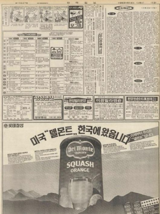 <한국일보> 논설위원들이 쓰는 칼럼 '지평선'은 미처 생각지 못했던 문제의식을 던지며 뉴스의 의미를 새롭게 해석하는 코너입니다.1983년 6월 4일 한국일보 12면. 롯데칠성이 게재한 델몬트 광고가 보인다. |