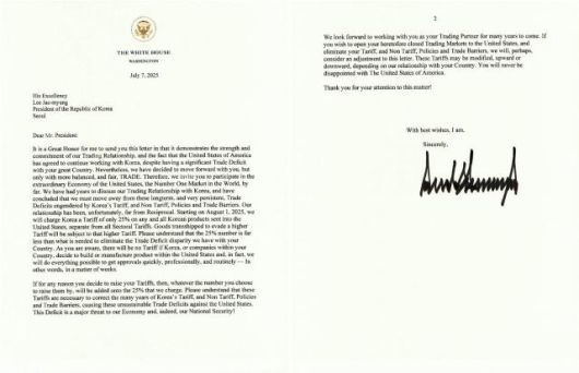 도널드 트럼프 미국 대통령은 7일(현지시간) 트루스소셜을 통해 한국에 보낸 무역 서한을 공개하면서 "8월 1일부터 미국은 모든 한국산 제품에 대해 25% 관세를 부과할 예정"이라고 밝혔다. 지난 4월 발표한 상호관세율과 동일한 것으로 문건 수신자는 이재명 대통령이다.