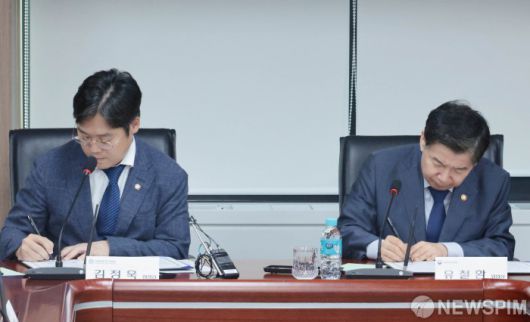 [서울=뉴스핌] 이길동 기자 =유철환 국민권익위워회 위원장과 김정욱 대한변호사협회 회장이 8일 서울 종로구 정부서울청사에서 열린 국민권익위-대한변호사협회 업무협약 체결식에서 협약서에 서명하고 있다.2025.07.08 gdlee@newspim.com