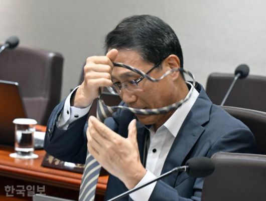 8일 대통령실에서 열린 국무회의에 참석한 유재성 경찰청 차장이 복장이 노타이 차림이라는 사실을 뒤늦게 알고 넥타이를 풀고 있다. 왕태석 선임기자 |