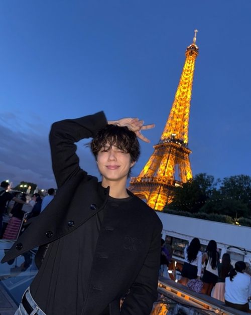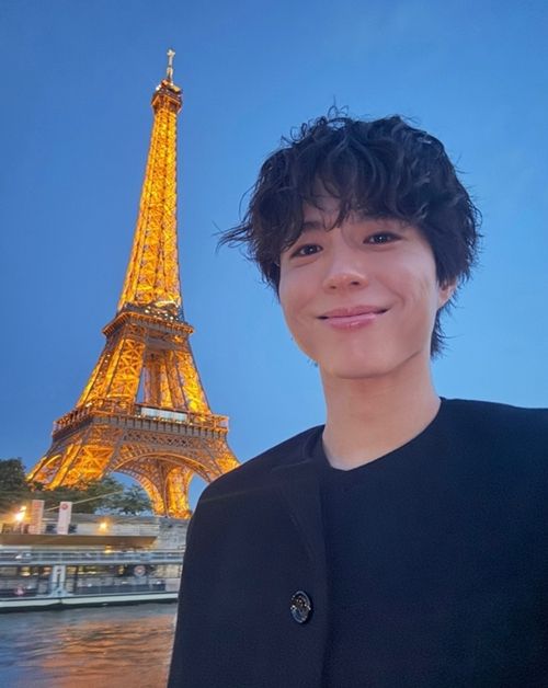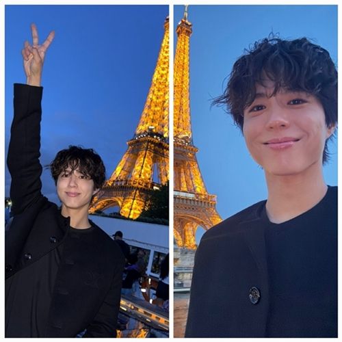 첫 번째 사진에선 저녁 하늘 아래 황금빛으로 빛나는 에펠탑을 배경으로, 검은 재킷을 입은 박보검이 환히 웃고 있었다. 머리는 자연스레 흐트러졌고, 조명 아래 그의 미소는 더 밝게 번졌다.