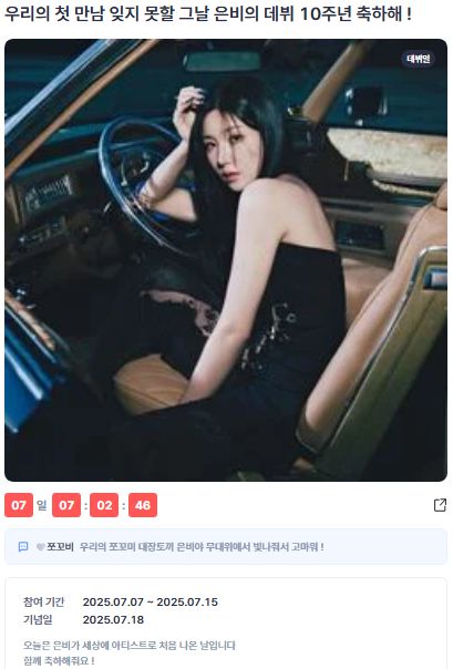이와 관련해 디시트렌드 기념 탭에서는 권은비의 데뷔 10주년을 축하하는 이벤트가 진행 중이다. 참여 기간은 지난 7일부터 오는 15일까지며, 기념일은 권은비의 데뷔일인 7월 18일이다. 해당 이벤트 제목에는 "우리의 첫 만남 잊지 못할 그날 은비의 데뷔 10주년 축하해!"라는 문구가 등록되어 팬들의 참여를 독려하고 있다.