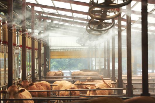 연일 폭염이 이어지는 8일 충북 제천시 봉양읍 명암리에 위치한 한우 축사에 살수시설이 풀 가동되고 있다. /뉴스1 |